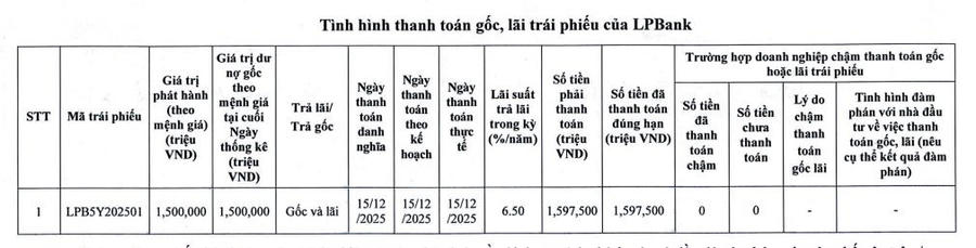 Cụ thể, vào ngày 15/12/2025 là ngày đáo hạn của trái phiếu mã LPB5Y202501 với giá trị phát hành là 1.500 tỷ đồng. Trong ngày này, LPBank đã thanh toán tổng cộng 1.597,5 tỷ đồng tiền gốc và lãi, qua đó tất toán đúng hạn trái phiếu LPB5Y202501.