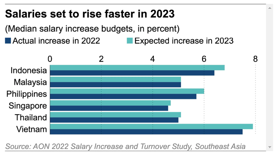 Công ty dịch vụ Aon (Mỹ) đã tiến hành khảo sát ý kiến với hơn 700 công ty trên khắp ASEAN về lương và tỷ lệ nghỉ việc. Kết quả cuộc khảo sát được công bố trong tháng này cho thấy, ngân sách tăng lương trung bình giữa các ngành trong năm 2023 được dự báo ở mức 6,8% đối với Indonesia, 5,1% đối với Malaysia, 6% đối với Philippines, 4,7% đối với Singapore, 5,1% đối với Thái Lan và 7,9% đối với Việt Nam. Tỷ lệ tăng lương của các quốc gia đều cao hơn so với năm 2022 ngoại trừ Malaysia.
