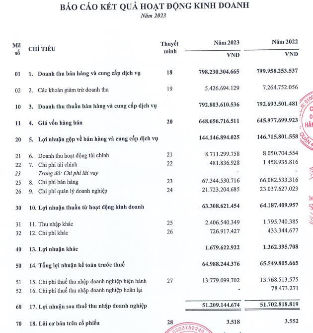 Theo đó, trong năm 2023, doanh nghiệp ghi nhận doanh thu thuần đạt 798,2 tỷ đồng, gần như đi ngang so với năm 2022.