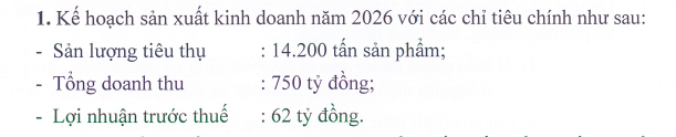 Trong năm 2026, Safoco đặt mục tiêu tiêu thụ 14.200 tấn sản phẩm, doanh thu đạt 750 tỷ đồng và lợi nhuận trước thuế 62 tỷ đồng, tăng nhẹ so với năm trước. Tỷ lệ cổ tức dự kiến tiếp tục duy trì ở mức 30%.