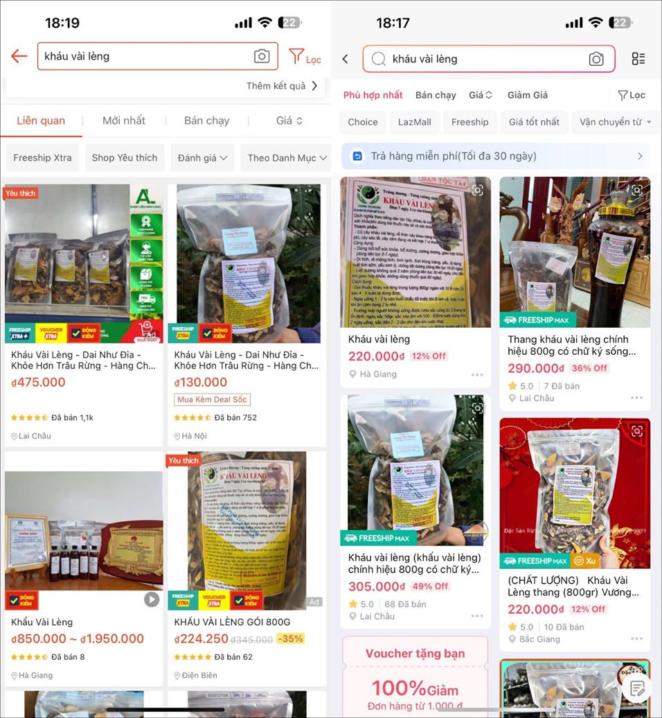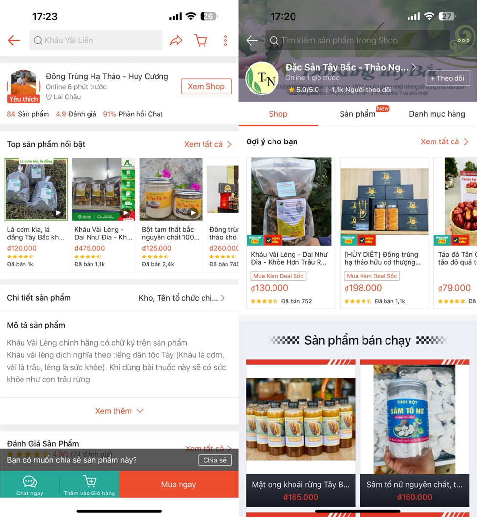 Cụ thể, khi gõ từ khóa Kháu vài Lèng trên Shoppe có cả trăm gian hàng đang bán sản phẩm này. Nổi bật nhất là gian hàng Đông Trùng Hạ Thảo - Huy Cương ở Lai Châu đã có tới hơn 1000 lượt mua sản phẩm Kháu Vài Lèng. Gian hàng Đặc Sản Tây Bắc - Thảo Nguyên địa chỉ Hà Nội cũng tới hơn 700 lượt mua hàng.