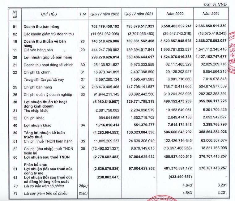 Tính chung cả năm 2022, công ty đạt hơn 3.521 tỷ đồng doanh thu và 401 tỷ đồng lợi nhuận sau thuế, tăng lần lượt 32% và 45% so với năm trước.