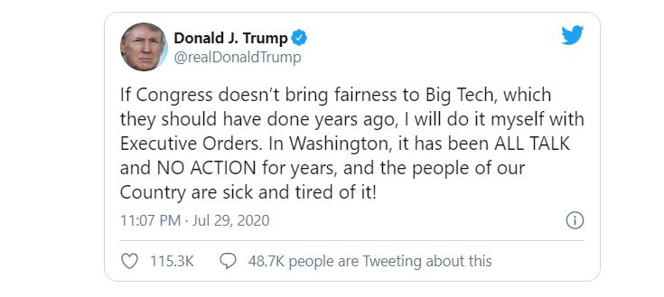 Trước đó, ngay khi phiên điều trần diễn ra, Tổng thống Mỹ Donald Trump đã đăng lên trang Twitter cá nhân. Ông Donald Trump chỉ trích Quốc hội nước này khi quá chậm trễ trong việc thực hiện điều trần với các đại gia công nghệ. Mọi sự điều hành chỉ là nói mà không có hành động và người dân nước Mỹ đã quá mệt mỏi và chán chường.