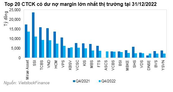 Tính tới cuối năm 2022, dư nợ margin của 20 CTCK đứng đầu thị trường ở mức 103.146 tỷ, chiếm 84% tổng dư nợ toàn thị trường, giảm 35% so với đầu năm 2022. Mặc dù SSI là CTCK có dư nợ lớn nhất thị trường vào thời điểm đầu năm với khối nợ 23.698 tỷ đồng, nhưng đến cuối năm 2022 Mirae Asset mới là CTCK có dư nợ margin lớn nhất toàn thị trường, ở mức 13.598 tỷ đồng (thấp hơn 21,3% so với thời điểm đầu năm).