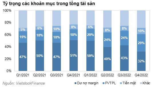 Mặt khác, khi dư nợ margin các CTCK giảm xuống, các tài sản khác có xu hướng tăng lên. Tỷ trọng của các tài sản tài chính thông qua lãi/lỗ (FVTPL) cũng tăng lên từ 20% vào thời điểm cuối quý 1/2022 lên mức 29% vào thời điểm cuối năm 2022. Ngoài ra, các CTCK cũng đang ngồi trên núi tiền mặt với giá trị 39.040 tỷ đồng (tỷ trọng 10%) ghi nhận vào cuối năm 2022, cùng kỳ năm trước chỉ ghi nhận 29.518 tỷ đồng (tỷ trọng 8%).