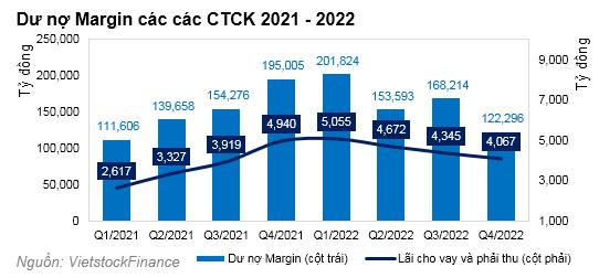 Xu hướng sụt giảm dư nợ margin cũng kéo theo lãi vay từ hoạt động margin của các CTCK. Đến cuối quý 4/2022 lãi từ cho vay và phải thu (chủ yếu từ margin) chỉ còn 4.067 tỷ đồng, giảm 20% so với đầu năm. Nhưng so với năm 2021, lũy kế các khoản lãi cho vay và phải thu của các CTCK tăng 22,5%, lên mức 18.140 tỷ đồng.