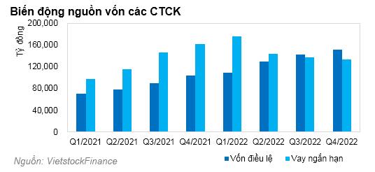Tới cuối năm, tổng vốn điều lệ các CTCK đã tăng lên mốc 150.968 tỷ đồng, tăng 45% so với đầu năm. Trong khi đó, vốn vay ngắn hạn giảm xuống còn 132.768 tỷ đồng tại thời điểm cuối năm 2022, thấp hơn 17,6% so với đầu năm.