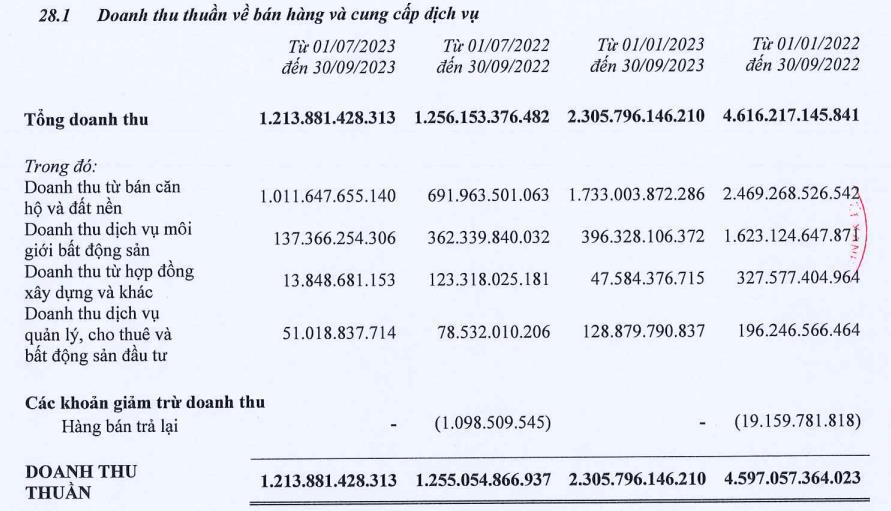 Về cơ cấu doanh thu, doanh thu mảng kinh doanh bất động sản giảm 62%, ghi nhận tại 137,3 tỷ đồng. Mảng chuyển nhượng bất động sản trở thành điểm sáng của công ty khi ghi nhận doanh thu tăng 46%, lên mức 1.011,6 tỷ đồng.