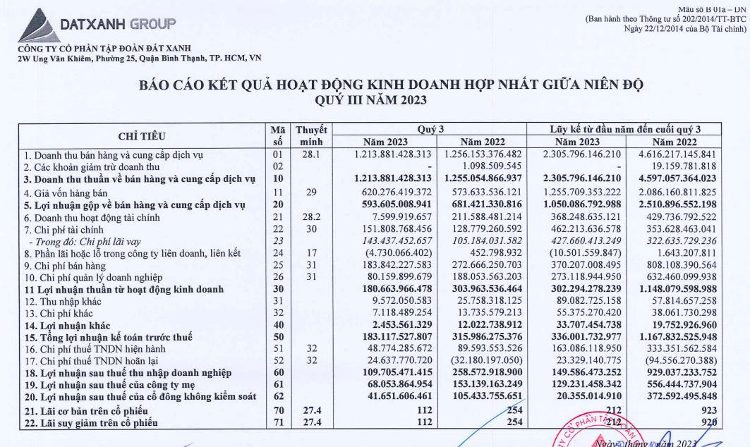 Lý giải về sự suy giảm kết quả kinh doanh này, Đất Xanh cho biết lãi sau thuế quý III/2023 "sụt" chủ yếu do mức giảm lợi nhuận của mảng dịch vụ môi giới bất động sản. Sau giai đoạn khó khăn kéo dài suốt nhiều tháng của thị trường kể từ quý IV/2022, mảng hoạt động này của tập đoàn chỉ vừa mới bắt đầu có sự hồi phục trong quý III/2023.