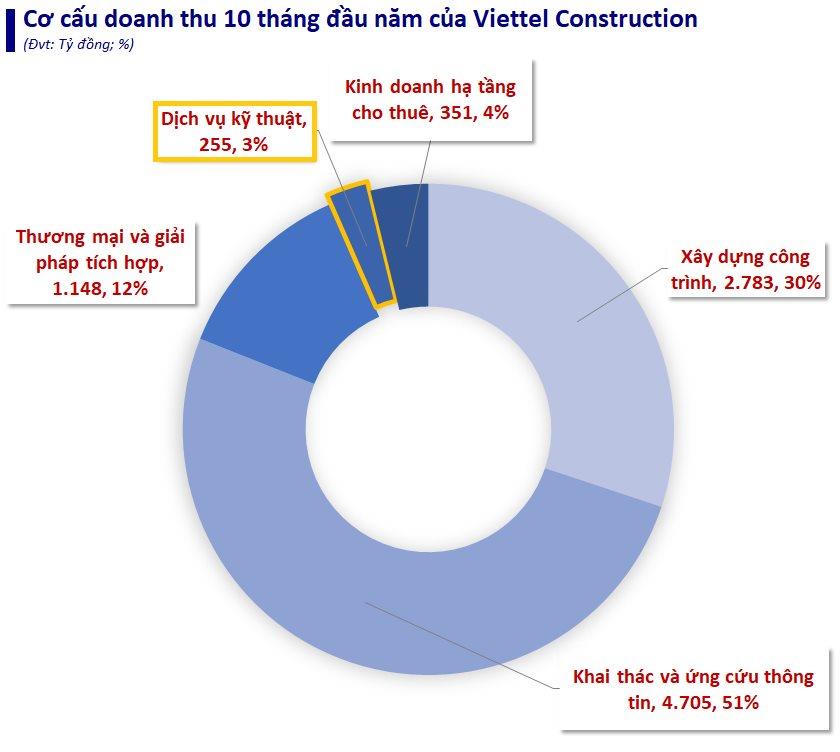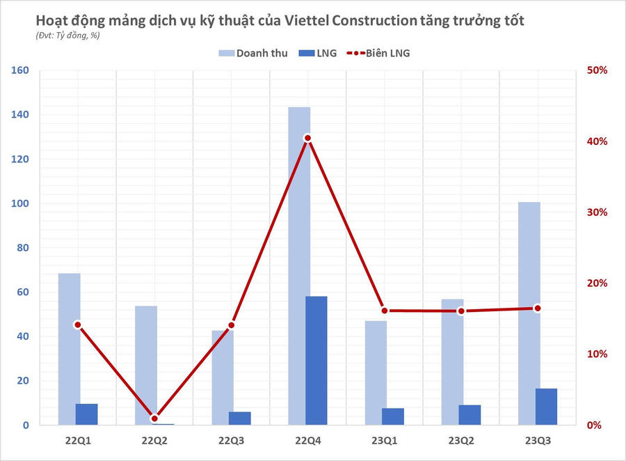 Sang tới 10 tháng đầu năm 2023, mảng dịch vụ kỹ thuật mang về cho Viettel Contrucstion hơn 255 tỷ đồng doanh thu , tăng trưởng 14% so với cùng kỳ năm trước và chiếm khoảng 3% doanh thu toàn công ty.
