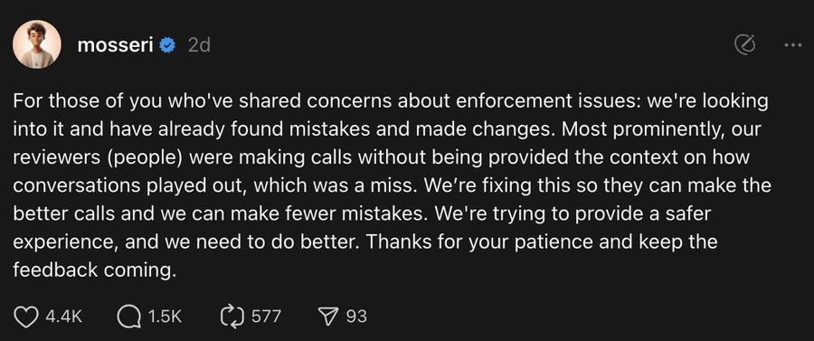 Mosseri không giải thích chính xác tại sao những lỗi này lại xảy ra trên nền tảng, nhưng cho biết một trong những công cụ của công ty đã “gặp vấn đề”. Mosseri nhấn mạnh rằng các sai sót liên quan đến việc các nhân viên kiểm duyệt đưa ra quyết định mà không có ngữ cảnh đầy đủ, và không thể thấy cách các cuộc hội thoại diễn ra.
