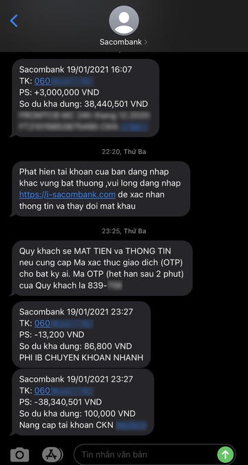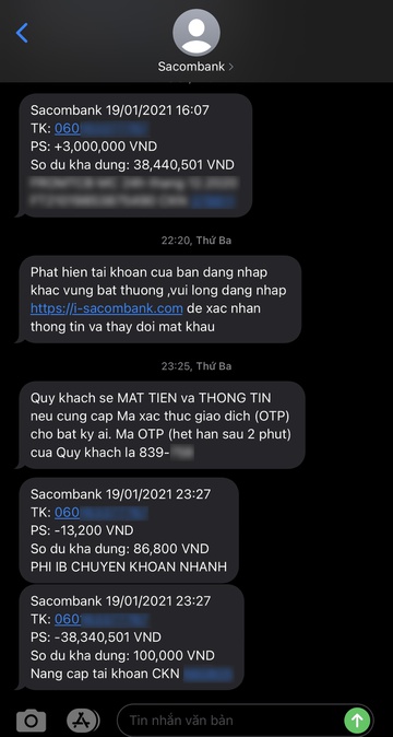 Chia sẻ với Zing, Chị T. Q (sống tại TP.HCM) cho biết vào lúc 20h20 ngày 19/1 nhận được một tin nhắn từ Sacombank với nội dung “Phát hiện tài khoản của bạn đăng nhập khác vùng bất thường, vui lòng đăng nhập https://i-sacombank.com để xác nhận thông tin và thay đổi mật khẩu”.