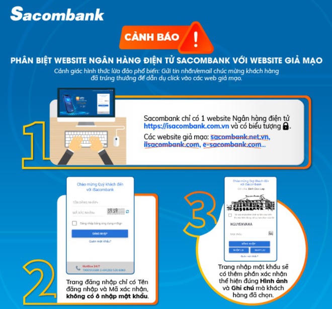 Sacombank đồng thời khuyến cáo các khách hàng tuyệt đối không truy cập vào bất cứ đường link nào khác ngoài website ngân hàng điện tử chính thức isacombank.com.vn của Sacombank và không cung cấp các thông tin bảo mật như mật khẩu, OTP, mã PIN thẻ cho bất cứ ai kể cả nhân viên ngân hàng.