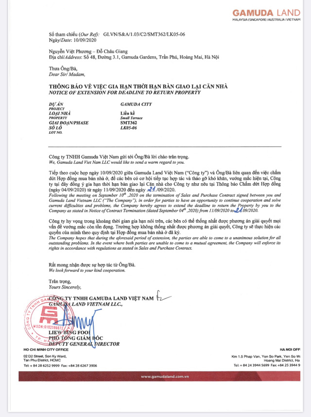 Được biết, trước những phản ánh gay gắt của khách hàng, ngày 10/9 trước ngày chấm dứt Hợp đồng mua bán, Gamuda Land tiếp tục gửi đến khách hàng Thông báo về việc gia hạn thời gian bàn giao lại căn nhà.