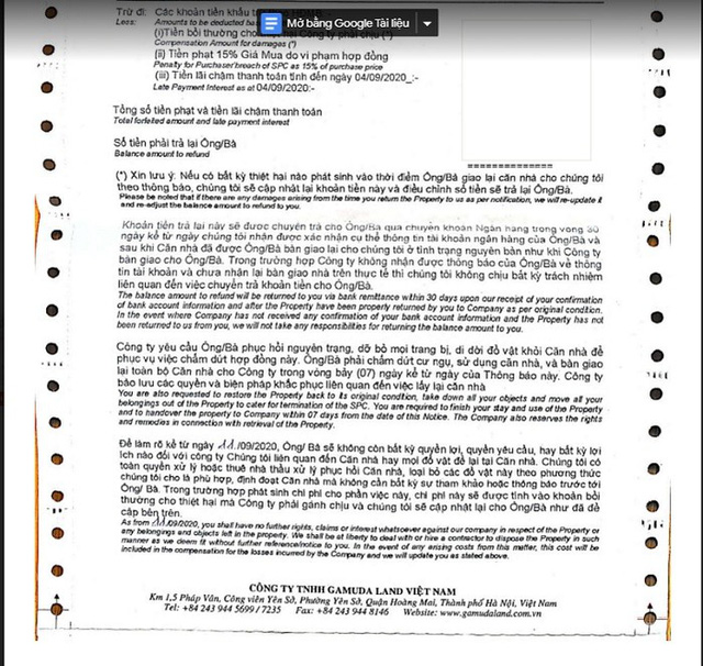 Văn bản chấm dứt hợp đồng và yêu cầu trả nhà của Gamuda Land gửi đến khách hàng.
