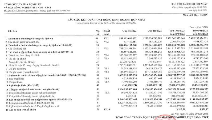 Theo báo cáo tài chính hợp nhất quý III/2023, doanh thu thuần VEA ghi nhận đạt 884,4 tỷ đồng, giảm 28,2% so với cùng kỳ.