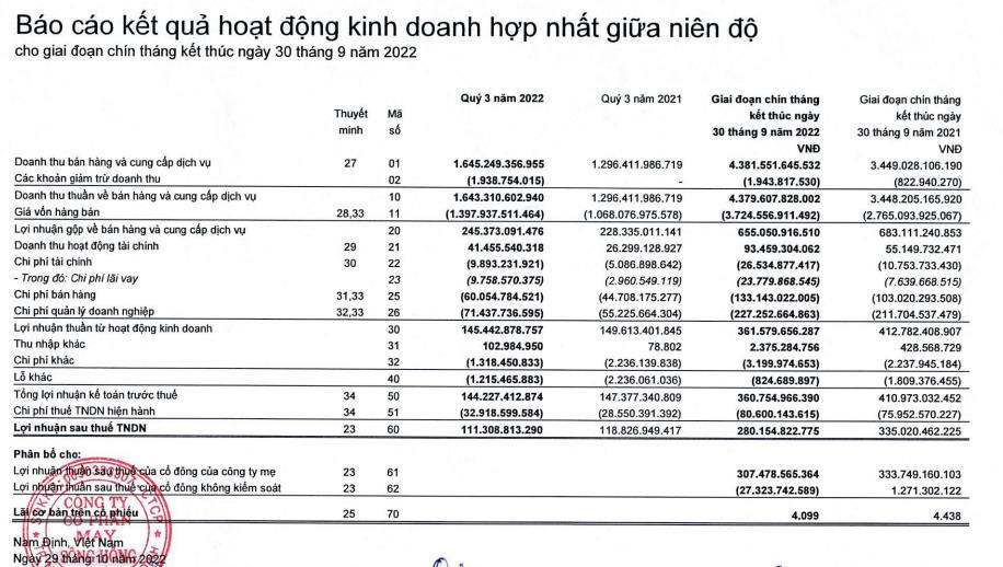 Về kết quả kinh doanh, trong quý III/2022, công ty May Sông Hồng ghi nhận doanh thu đạt 1.645 tỷ đồng, tăng 26,7% so với cùng kỳ.
