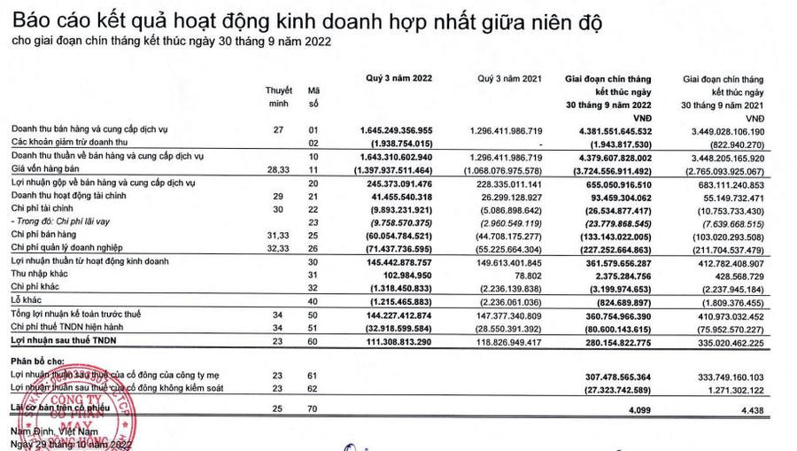 Lũy kế 9 tháng đầu năm, Công ty đạt 4.381 tỷ đồng doanh thu và 280 tỷ đồng lợi nhuận sau thuế.