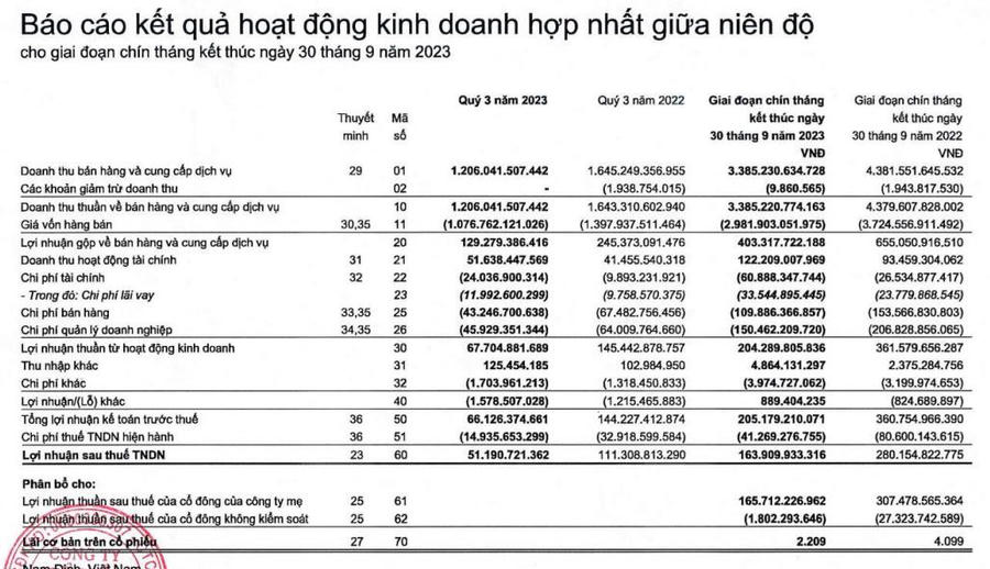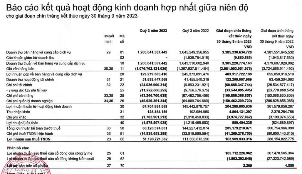 Trong kỳ, giá vốn hàng bán giảm 23% về mức 1.076 tỷ đồng, lợi nhuận gộp về bán hàng, cung cấp dịch vụ giảm 47% về 129,2 tỷ đồng.