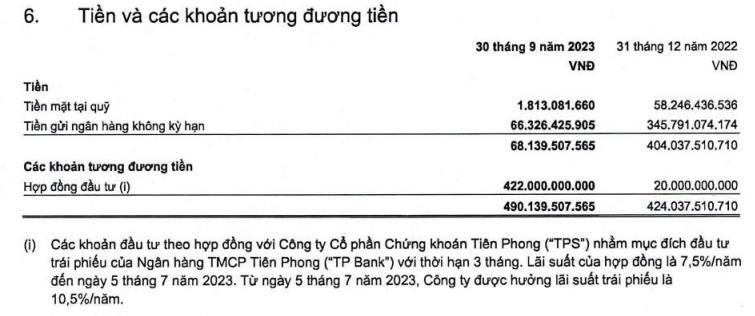 Khoản tiền gửi ngân hàng không kỳ hạn đạt 66,3 tỷ đồng, chỉ bằng 1/5 so với đầu năm ghi nhận tại 345,7 tỷ đồng. Đáng chú ý, khoản tương đương tiền tăng vọt lên mức 422 tỷ đồng, gấp 21,1 lần so với đầu năm.