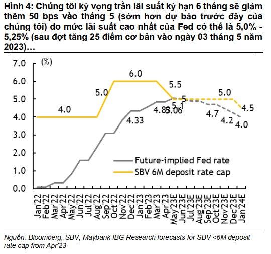 Đội ngũ phân tích dự báo vào tháng 5 NHNN sẽ hạ lãi suất điều hành (trần lãi suất huy động kỳ hạn 6 tháng, lãi suất tái cấp vốn) thêm 50 điểm cơ bản do lạm phát trong nước giảm và mức lãi suất của Fed có thể đạt đỉnh ở mức 5,125 % (sau khi tăng 25 điểm cơ bản vào ngày 3/5/2023)