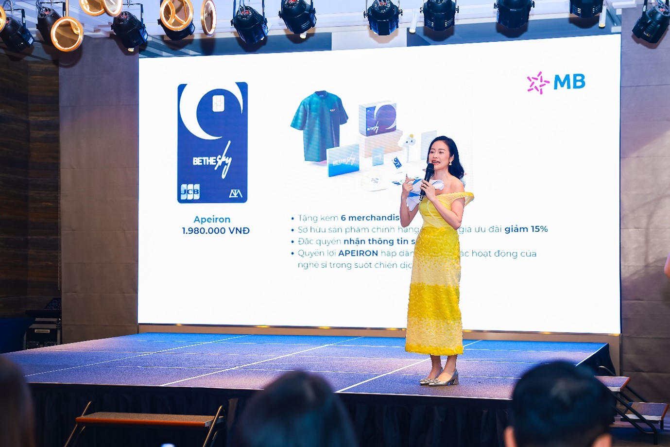 Mới đây, MB cũng chính thức tung ra sản phẩm độc đáo Be The Sky - kết quả của quá trình hợp tác giữa ngân hàng, nghệ sĩ Sơn Tùng M-TP và tổ chức thẻ quốc tế JCB. Được thiết kế dành riêng cho cộng đồng fandom SKY, sản phẩm Be The Sky không đơn thuần là một sản phẩm tài chính mà còn kết tinh các yếu tố âm nhạc, nghệ thuật và công nghệ, kết nối người hâm mộ với thần tượng của họ.