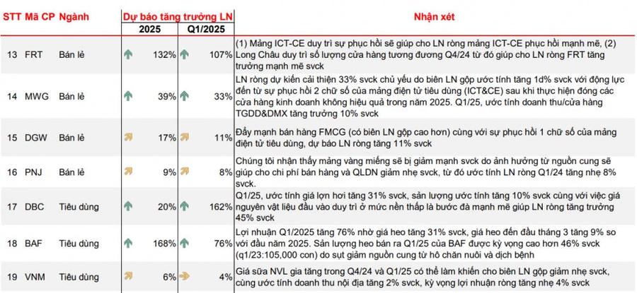 Tổng mức bán lẻ hàng hóa và doanh thu dịch vụ tiêu dùng hai tháng đầu năm 2025 tăng 6,2% so với cùng kỳ năm 2024, cho thấy sức mua nội địa đang dần cải thiện. Các doanh nghiệp bán lẻ, đặc biệt là nhóm hàng không thiết yếu, được kỳ vọng tăng trưởng lợi nhuận tích cực. Ngành bán lẻ điện tử tiêu dùng ghi nhận sự phục hồi mạnh mẽ về doanh thu và biên lợi nhuận gộp. Đơn cử, Thế Giới Di Động (MWG) báo cáo doanh thu hai chuỗi Thế Giới Di Động và Điện Máy Xanh tăng trưởng tốt. Trong lĩnh vực trang sức, PNJ được dự báo hưởng lợi từ sự dịch chuyển nhu cầu. Bên cạnh đó, mô hình bán lẻ hiện đại tiếp tục mở rộng với các chuỗi cửa hàng tiện lợi (GS25, 7-Eleven) và đại siêu thị (Aeon Mall, Go!).