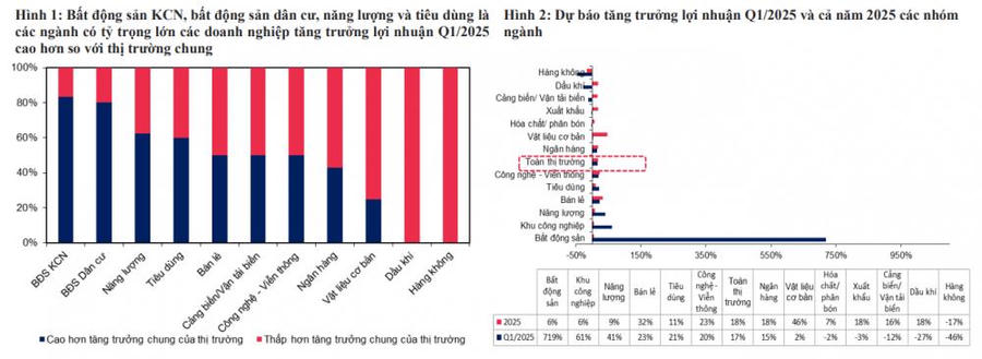 Theo đánh giá của MBS, quý 1/2025 được xem là giai đoạn khởi đầu thuận lợi cho các doanh nghiệp niêm yết. Môi trường lãi suất thấp tiếp tục được duy trì, nhu cầu tiêu dùng nội địa phục hồi và dòng vốn đầu tư có dấu hiệu quay trở lại đang tạo điều kiện cho nhiều lĩnh vực. Các ngành được dự báo có mức tăng trưởng lợi nhuận nổi bật trong quý đầu năm bao gồm Bất động sản (+719%), Khu công nghiệp (+61%), Năng lượng (+41%), và Ngân hàng (+15%).