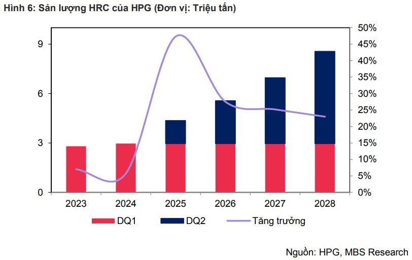 Theo dự báo của MBS, nhà máy Dung Quất 2 sẽ hoạt động hết công suất vào năm 2028, đóng góp khoảng 5,6 triệu tấn, giúp tổng sản lượng HRC của Hòa Phát đạt 8,6 triệu tấn (tăng 187% so với năm 2024).