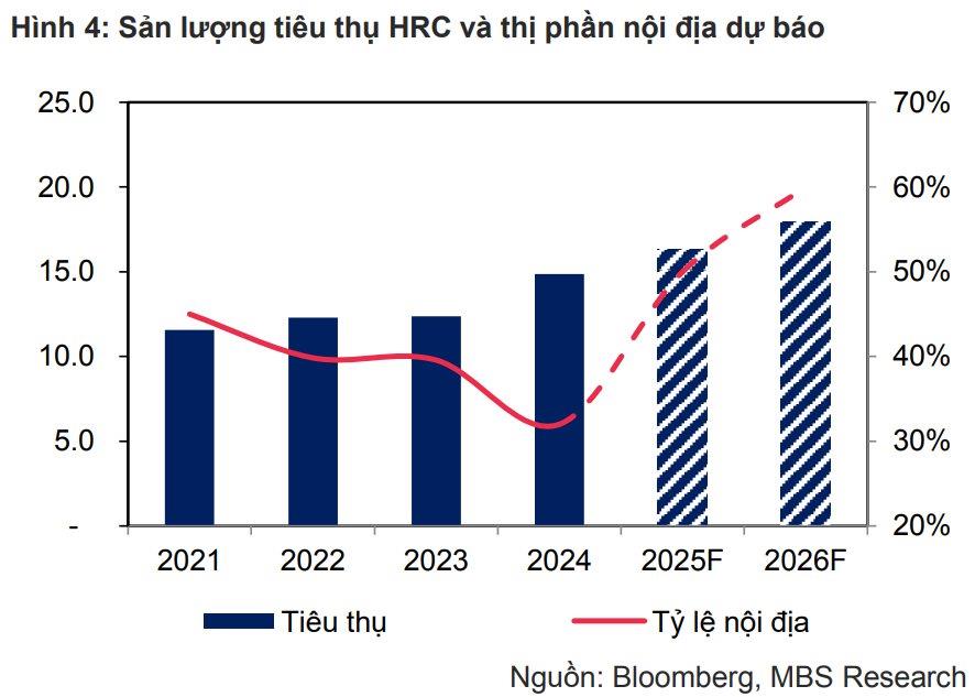 Không chỉ được hỗ trợ bởi thuế CBPG, thị trường thép HRC còn có triển vọng tăng trưởng tích cực trong những năm tới. MBS dự báo nhu cầu tiêu thụ HRC sẽ tăng trưởng 10% mỗi năm trong giai đoạn 2025-2026, đạt 16,3-17,9 triệu tấn, nhờ sự phục hồi của ngành tôn mạ và các ngành sản xuất khác như ô tô. Sau năm 2026, các dự án hạ tầng giao thông lớn như đường sắt cao tốc Bắc – Nam được kỳ vọng sẽ tạo cú hích lớn cho nhu cầu thép.