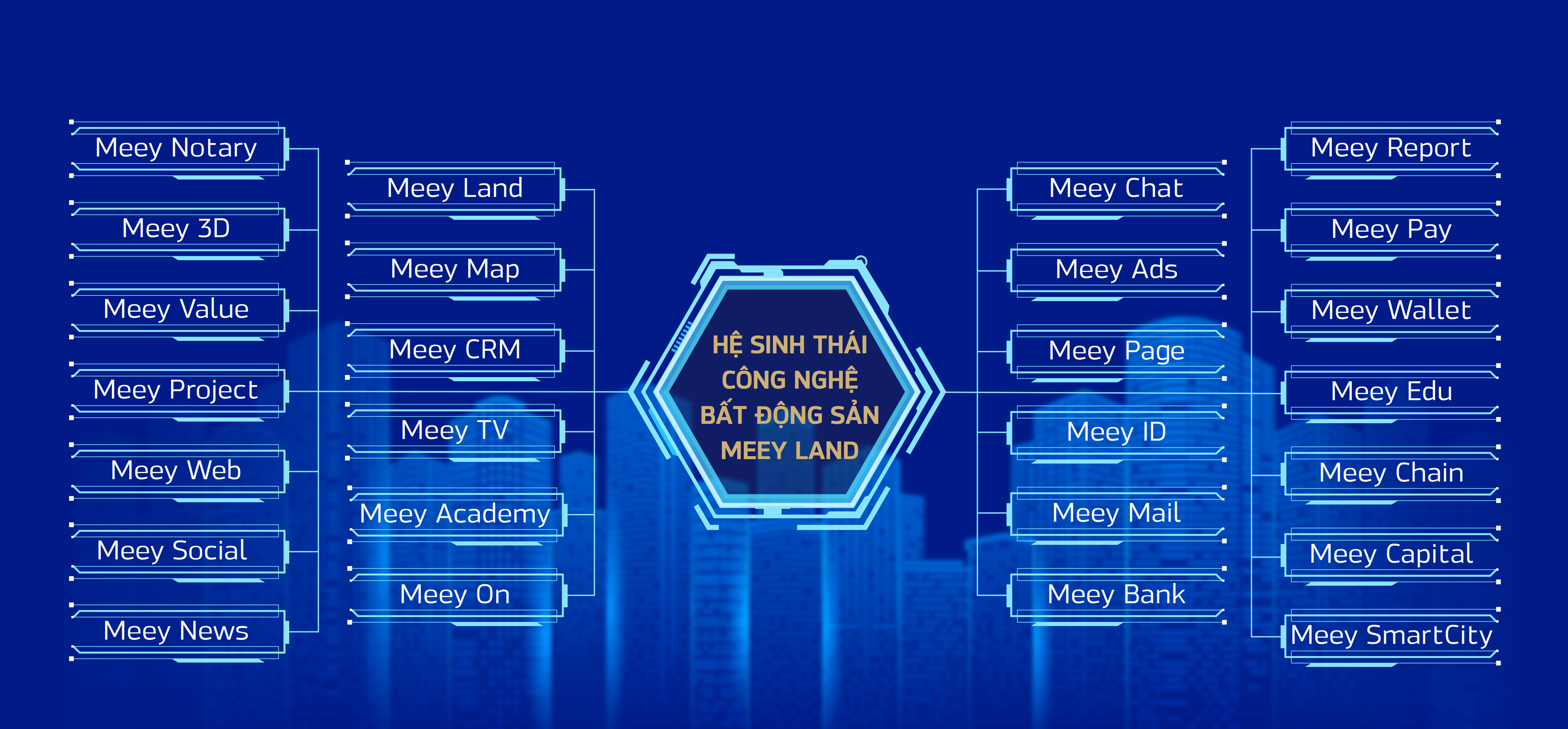 Hệ sinh thái Công nghệ Bất động sản Meey Land lấy công nghệ làm cốt lõi, đã đem đến các sản phẩm như: website meeyland.com, app Meey Land, Meey Page, Meey Ads, Meey Map, Meey CRM,... Đây là những sản phẩm hàng đầu được áp dụng công nghệ hiện đại, tiên tiến hàng đầu như công nghệ AI, Blockchain, Big Data.
