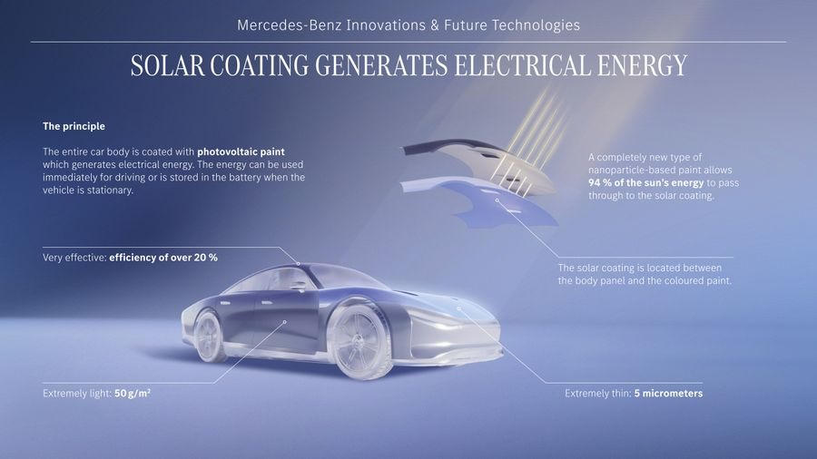 Mercedes-Benz đang phát triển một loại "sơn năng lượng mặt trời" tiên tiến, có thể giúp xe hấp thụ năng lượng trong khi tiếp xúc với ánh nắng Mặt Trời. Và như chúng ta vẫn biết, một chiếc xe thường xuyên tiếp xúc với ánh sáng, bất kể khi di chuyển hay khi đang đỗ.