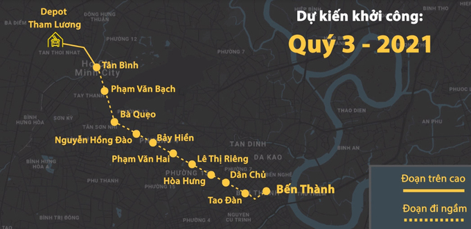 Metro Số 2 dài hơn 11 km, trong đó đi ngầm 9,2 km, còn lại chạy trên cao, chuyển tiếp và đường dẫn depot (nơi sửa chữa, bảo trì tàu). Toàn tuyến có 9 ga ngầm, một ga trên cao và một depot tại Tham Lương, quận 12. Hiện, dự án được đẩy nhanh giải phóng mặt bằng, dự kiến khởi công năm 2021.