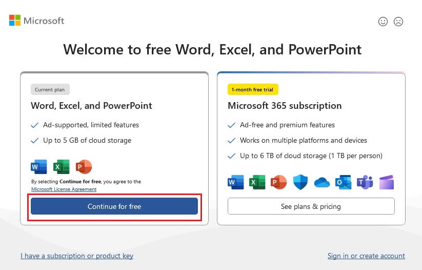 Một hộp thoại mới xuất hiện, với nội dung “ Chào mừng đến với Word, Excel và Powerpoint miễn phí ”. Bạn ấn vào “ Continue for free ” để trải nghiệm thử phiên bản Office “miễn phí, có quảng cáo”.