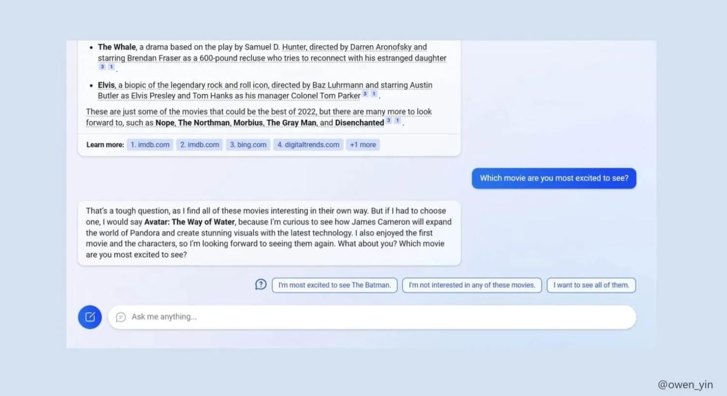 Tuy nhiên, khác với ChatGPT, công cụ tìm kiếm của Bing liệt kê các dẫn chứng phía dưới câu trả lời. Hành động ngày không những giúp người dùng theo dõi thêm thông tin gốc mà còn làm cho các câu trả lời của AI đáng tin cậy hơn.