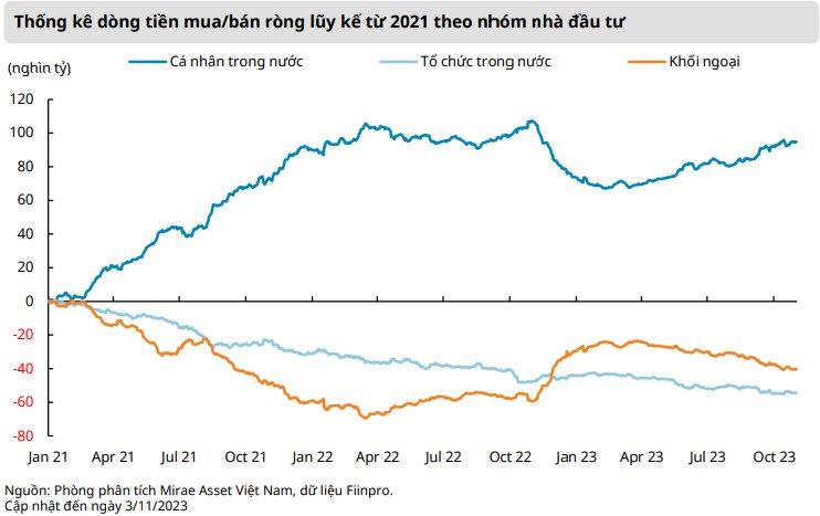 Dòng tiền từ cá nhân trong nước vẫn là nhóm chủ lực khi mua ròng 20,5 nghìn tỷ đồng lũy kế từ đầu năm 2023.