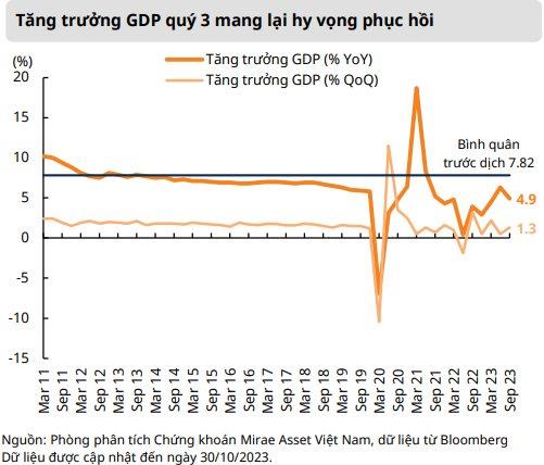 Đối với triển vọng quý 4, đội ngũ phân tích Mirae Asset hạ kỳ vọng, song vẫn duy trì triển vọng cho năm 2024. Theo Mirae Asset, xuất khẩu và tiêu dùng nội địa phục hồi và đầu tư công sẽ được tăng tốc trong thời gian tới.