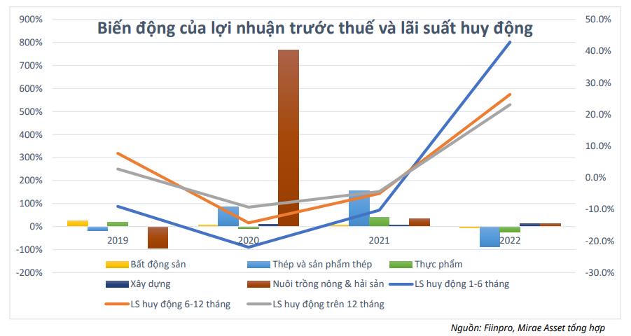 Ngược lại, Ngân hàng Nhà nước liên tục tăng lãi suất từ 3,5%/năm lên 5%/năm đối với kỳ hạn 1 - 6 tháng trong năm 2022 cũng là một nguyên nhân khiến cho lợi nhuận các nhóm này biến động mạnh, hầu hết điều ghi nhận mức giảm, ngoại trừ nhóm xây dựng vẫn có mức tăng nhẹ với 12,5%.