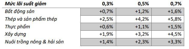 Với kịch bản trung tính nhất ở mức giảm lãi suất cho vay xuống 0,5%, điều này sẽ giúp cho ngành thép có thể cải thiện lợi nhuận trước thuế với mức tăng lớn nhất là 4,2% trong các nhóm ngành, trong khi những doanh nghiệp thực phẩm có mức biến động thấp nhất với 1,1% so với cùng kỳ năm ngoái.
