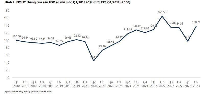 Căn cứ số liệu từ Bloomberg, so sánh EPS 12 tháng của sàn HSX với mốc Q1/2018 (đặt EPS Q1/2018 là mốc 100) khi chỉ số VN-Index trở lại mốc 1.200. EPS của HSX đã tạo đỉnh vào Q2/2022, trùng với mốc 1.500 của VN-Index (04/2022) sau đó liên tục giảm và đã có dấu hiệu tạo đáy vào Q1/2023. Tại thời điểm Q1/2023 khi EPS trở về mức tương đương giai đoạn 2018 - 2019, VN-Index cũng đã có diễn biến dao động quanh vùng 1000 - 1.100 so với vùng dao động 900 - 1.200 của giai đoạn 2018 - 2019.
