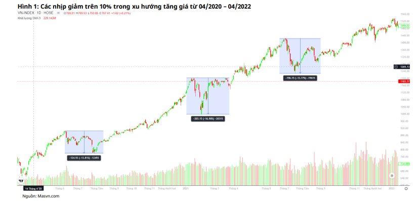 Tuy nhiên, Mirae Asset cho rằng ngay cả trong uptrend, VN-Index vẫn xuất hiện các nhịp điều chỉnh trên 10%. Lần gần đây nhất trong nhịp tăng mạnh từ vùng 650 lên 1.500 kéo dài hơn 2 năm (tháng 4/2020 đến 4/2022) VN-Index đã 3 lần xuất hiện các nhịp điều chỉnh trên 10%.