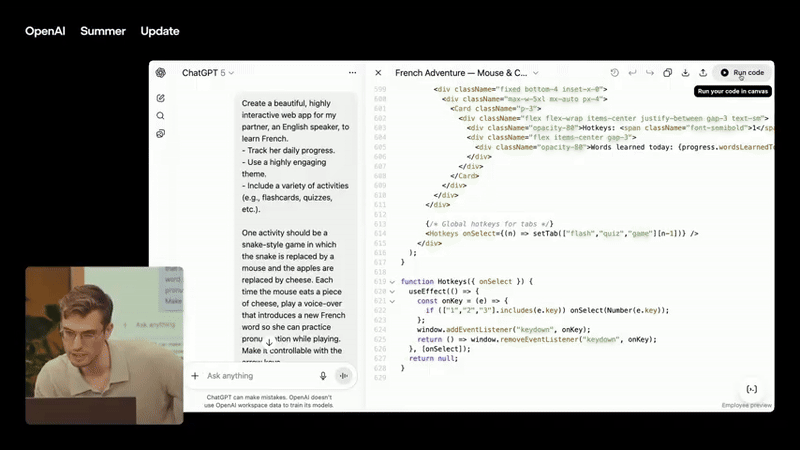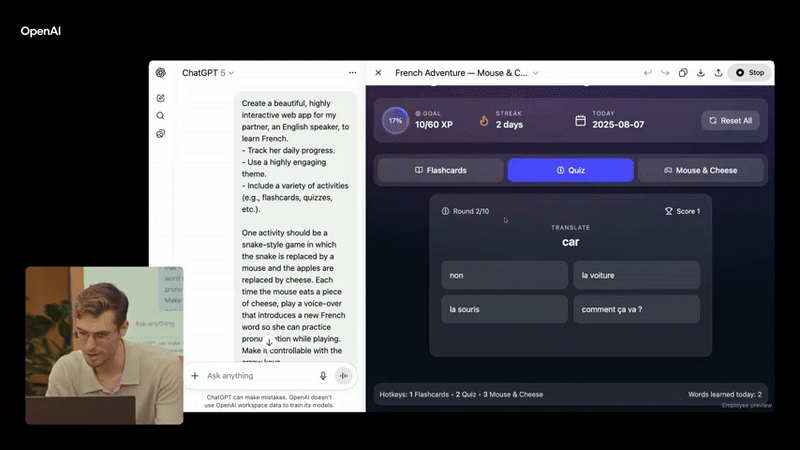 Sức mạnh này được minh chứng rõ ràng trong cuộc họp báo khi Yann Dubois, người đứng đầu bộ phận post-training của OpenAI, sử dụng GPT-5 để tạo ra một trang web học tiếng Pháp có trò chơi tương tác. Chỉ trong vài giây, GPT-5 đã viết hàng trăm dòng code và hiển thị giao diện frontend của trang web.