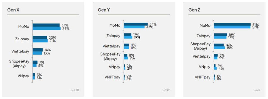 Xét trên độ tuổi người tiêu dùng, MoMo cũng là ví điện tử được ưa chuộng nhiều nhất tại Việt Nam ở tất cả các thế hệ (Gen X, Gen Y và Gen Z) với mức độ yêu thích 48%, tăng 2% so với quý IV năm ngoái.