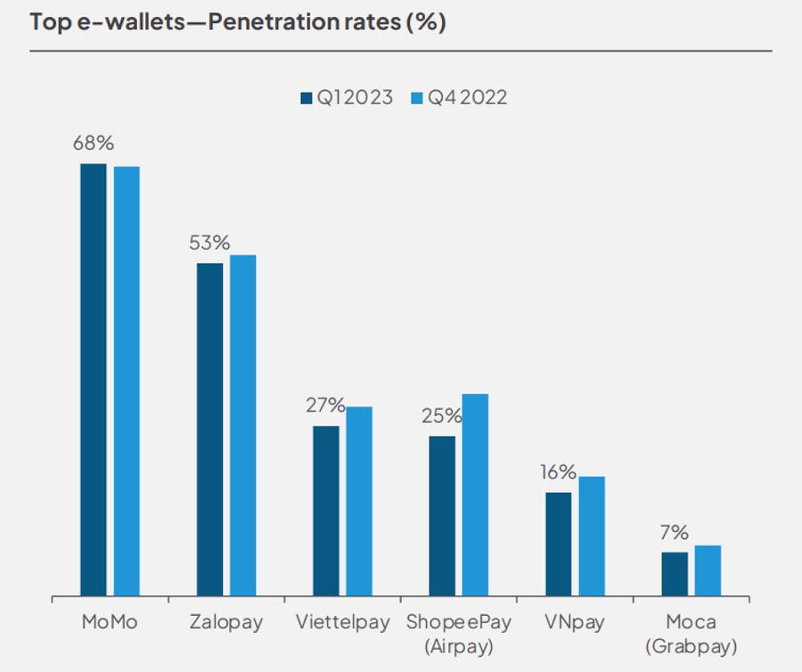 MoMo đứng đầu về thị phần và là ví điện tử được ưa chuộng nhất Việt Nam trong 3 tháng đầu năm 2023 khi chiếm 68% thị phần ví điện tử.