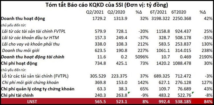 6 tháng đầu năm, SSI ghi nhận khoản 3.245 tỷ đồng doanh thu và 1.232 tỷ đồng lợi nhuận trước thuế, tăng trưởng lần lượt 38% và 84% so với nửa đầu năm ngoái.