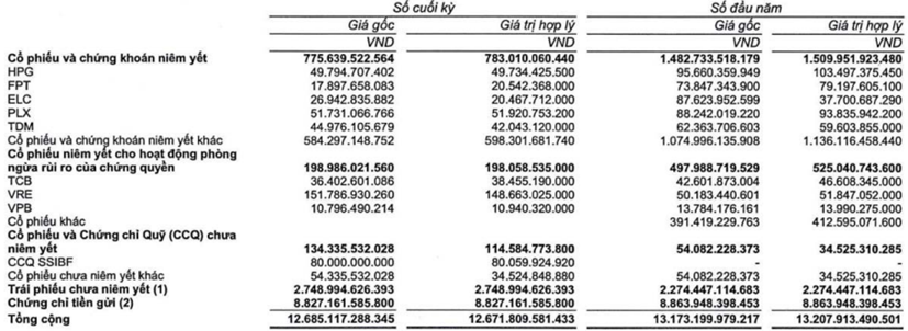 Trong khi đó, mảng tự doanh của SSI lại chưa thực sự hiệu quả với lãi từ các tài sản tài chính ghi nhận thông qua lãi/lỗ (FVTTPL) giảm 20% so với cùng kỳ, xuống 580 tỷ đồng. Giá trị danh mục FVTPL cuối kỳ đã giảm hơn 500 tỷ đồng so với đầu năm, còn 12.672 tỷ đồng trong đó các cổ phiếu có tỷ trọng lớn có thể kể đến như VRE, HPG, PLX,...