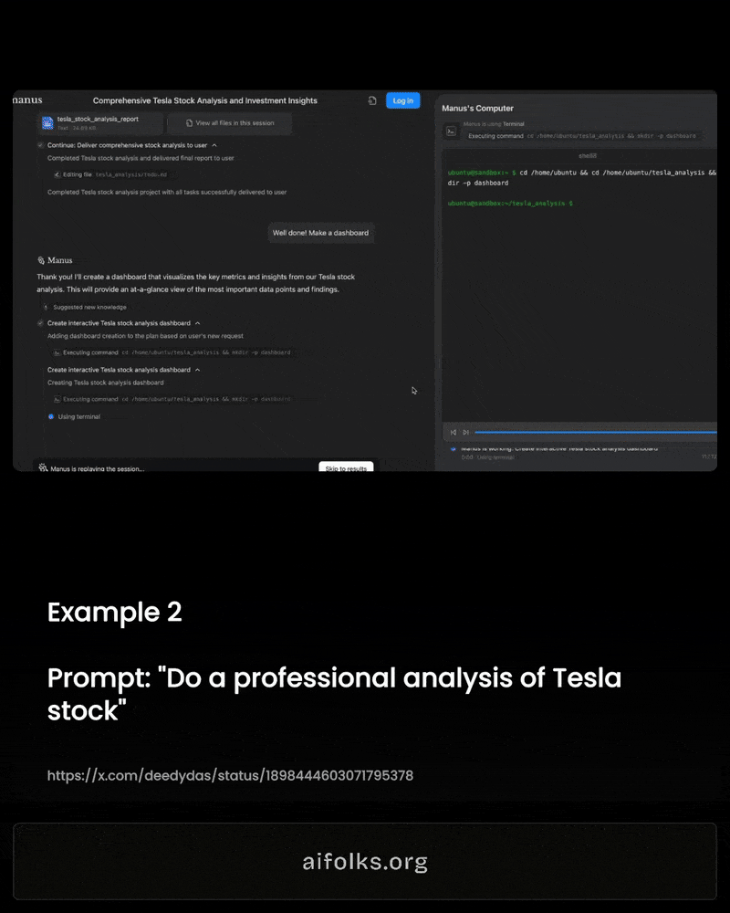 Một ví dụ của việc này được đề cập trên website của Manus là nghiên cứu phân tích cổ phiếu của Tesla. Thông thường một nhà phân tích chuyên nghiệp sẽ cần từ một vài ngày cho đến cả tuần để làm công việc này khi phải tìm kiếm và tổng hợp rất nhiều thông tin khác nhau để đánh giá, bao gồm các thông tin cơ bản như xu hướng doanh thu, lợi nhuận, dòng tiền, tiềm năng tăng trưởng, điểm mạnh, điểm yếu, các yếu tố rủi ro, ... Nhưng đối với Manus AI, bạn chỉ cần viết ra yêu cầu của mình, AI Agent này sẽ tự động tìm kiếm các thông tin đó, chọn lọc và tổng hợp để làm thành một báo cáo cho bạn chỉ trong vài phút.