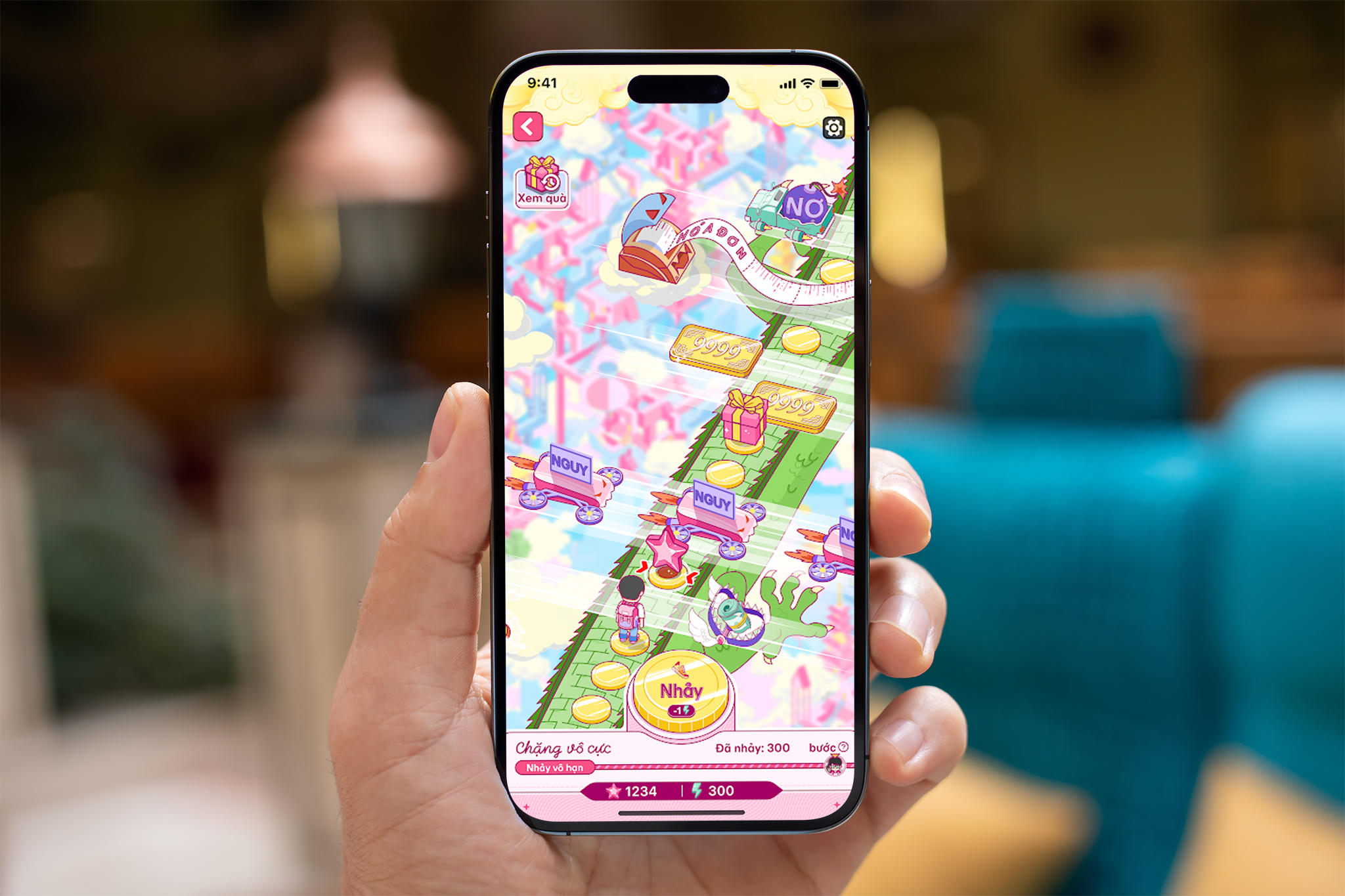 Chương trình được thiết kế với ba chặng cùng độ khó tăng dần để người dùng làm quen và “gặt hái” được nhiều phần quà và vật phẩm. Sau khi hoàn thành hai chặng đầu, người dùng sẽ được mở khóa chặng “Vô cực”, tại đây người dùng có thể nhảy không giới hạn để nhận thêm quà và vật phẩm Sao, đồng thời mở cơ chế Bảng Xếp Hạng và 999 người dùng có bước nhảy xa nhất mỗi ngày sẽ được thưởng Xu của MoMo Rewards.