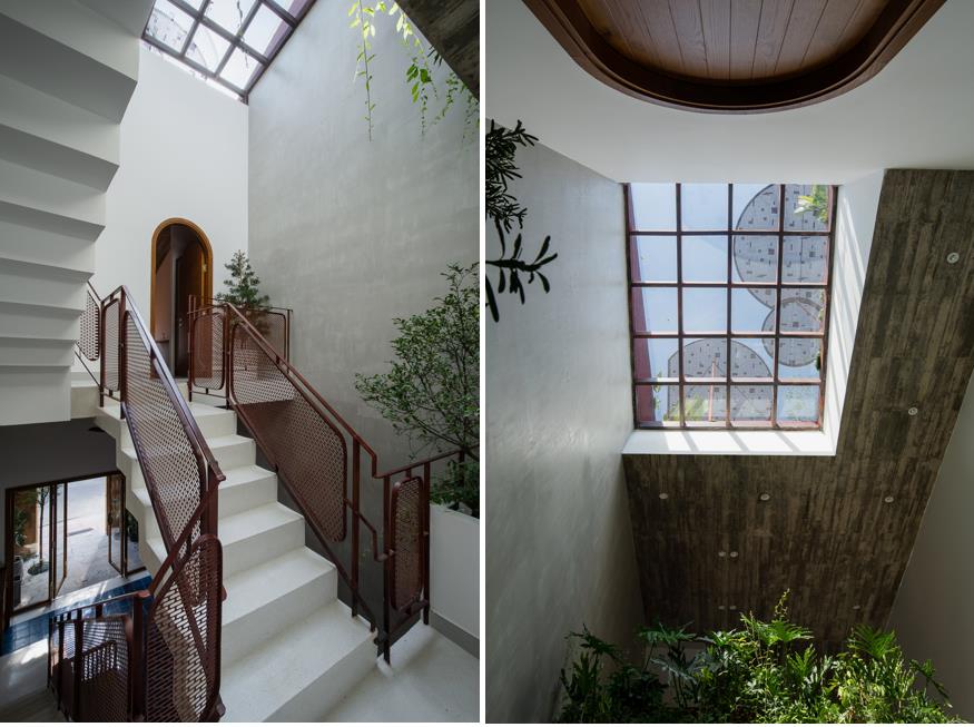 Tầng một và hai là các phòng ngủ, được thiết kế lệch tầng để tạo không gian và sự thông thoáng. Toàn bộ diện tích mái nhà thiết kế có độ dốc khác nhau, được tận dụng để trồng cây bóng mát, hoa và rau hữu cơ.