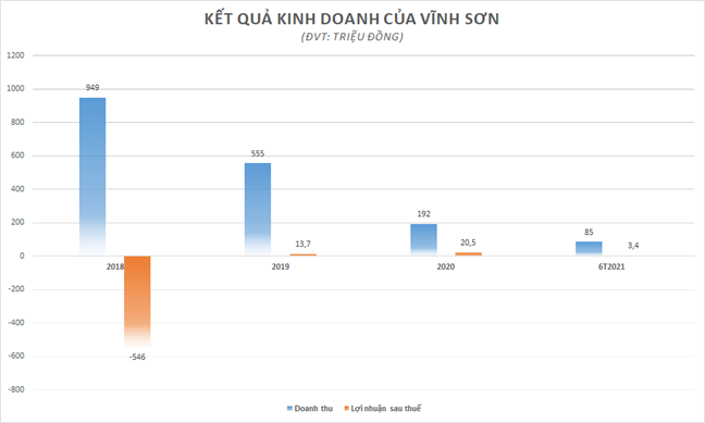 Những năm gần đây, doanh thu của Vĩnh Sơn liên tiếp sụt giảm mạnh và đến nửa đầu năm 2021 chỉ còn 85 triệu đồng. Công ty lãi vỏn vẹn 3,4 triệu đồng và vẫn còn lỗ lũy kế gần 92 triệu đồng tại thời điểm 30/6/2021.